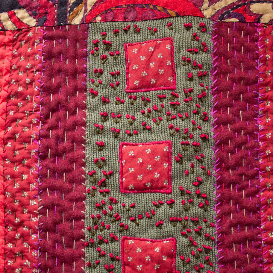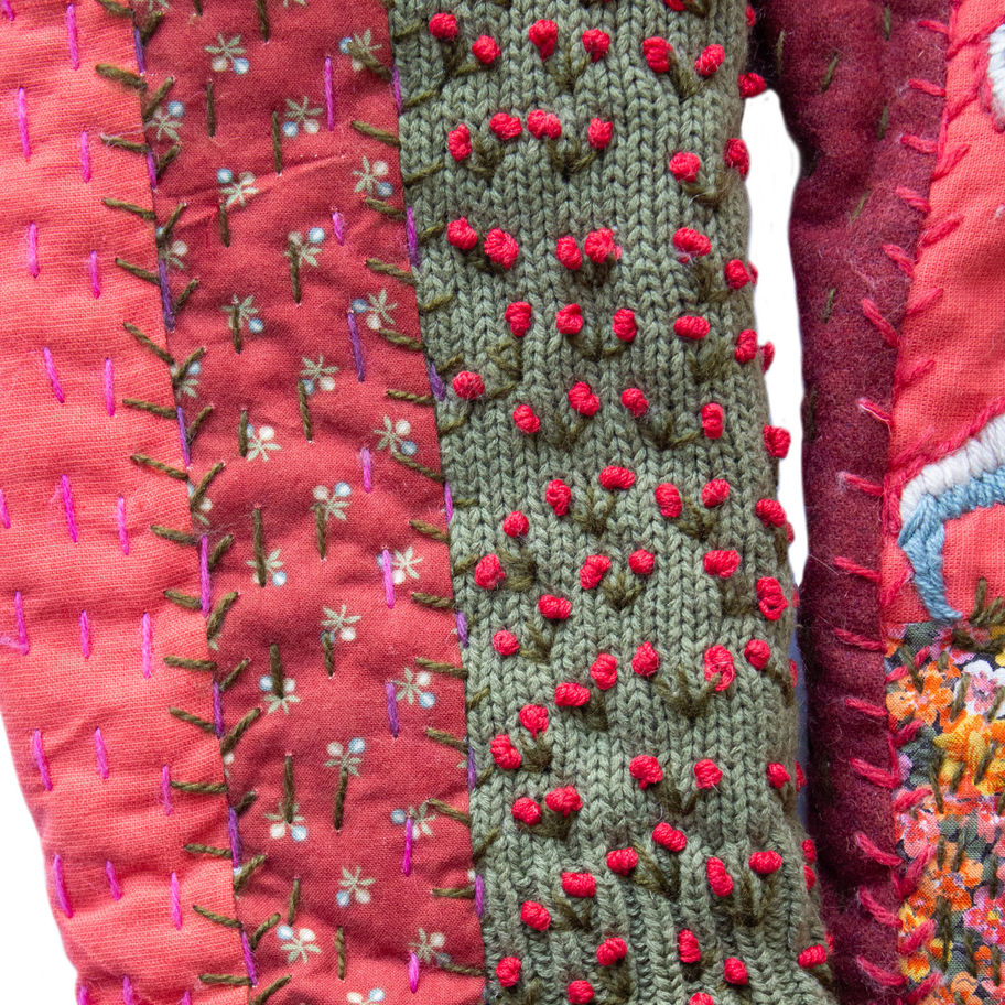 This jacket is truly one of a kind. Hand-quilted, hand-stitched, hand-embroidered, and crafted entirely from upcycled textiles. All surface of the jacket is covered with hand-embroidery in many different technics that make the jacket a statement piece. Perfect for those who value originality, craftsman ship, and sustainable fashion.
